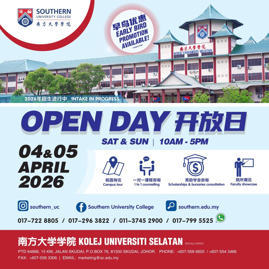 Registration for Southern University College’s 2026 intake is now open. Join us on 4 & 5 April 2026 to visit our campus, explore the environment, and learn more about our programmes, entry requirements, scholarships, and other important information.