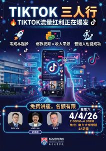 两天,两大主题,一次掌握未来趋势 Southern University College 特别策划 【数码行销 × AI 应用】系列公开讲座 连续两天,邀请多位重量级实战讲师 从 TikTok 流量变现,到 AI 自动化工作方式 带你看清趋势、学会应用、找到机会 ━━━━━━━━━━━━━━━ 第一场讲座 TikTok 三人行|TikTok 流量红利正在爆发 当短视频不只是娱乐,而是真正的商业工具 你将了解零成本起步、爆款内容逻辑 以及 TikTok 如何转化为稳定收入来源 主讲讲师 • Joseph Lim