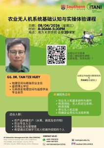 想掌握农业无人机操作与精准农业技术吗? 南方专业与推广学部联手 ITANI Smart Agriculture 带来一天满满干货的实操课程,让你从零基础快速掌握农业无人机应用! 日期:08/04/2026(星期三) 时间:8:30AM – 5:30PM 地点:南方大学学院 主楼2D课室 主讲人:GS. DR. TAM TZE HUEY • 地理空间与精准农业主任 • 遥感博士学位 • 马来西亚地理空间与遥感学会专业会员 课程亮点: • 农业无人机基本结构与部件 • 喷洒测绘、无人机定位系统与喷洒流程 • 参与无人机实操