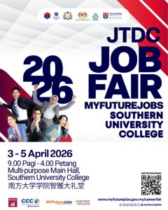Looking for career opportunities? Don’t miss out on this chance! Join the JTDC Job Fair MYFutureJobs @ Southern University College 2026, co-organised by Southern University College, PERKESO Johor and Johor